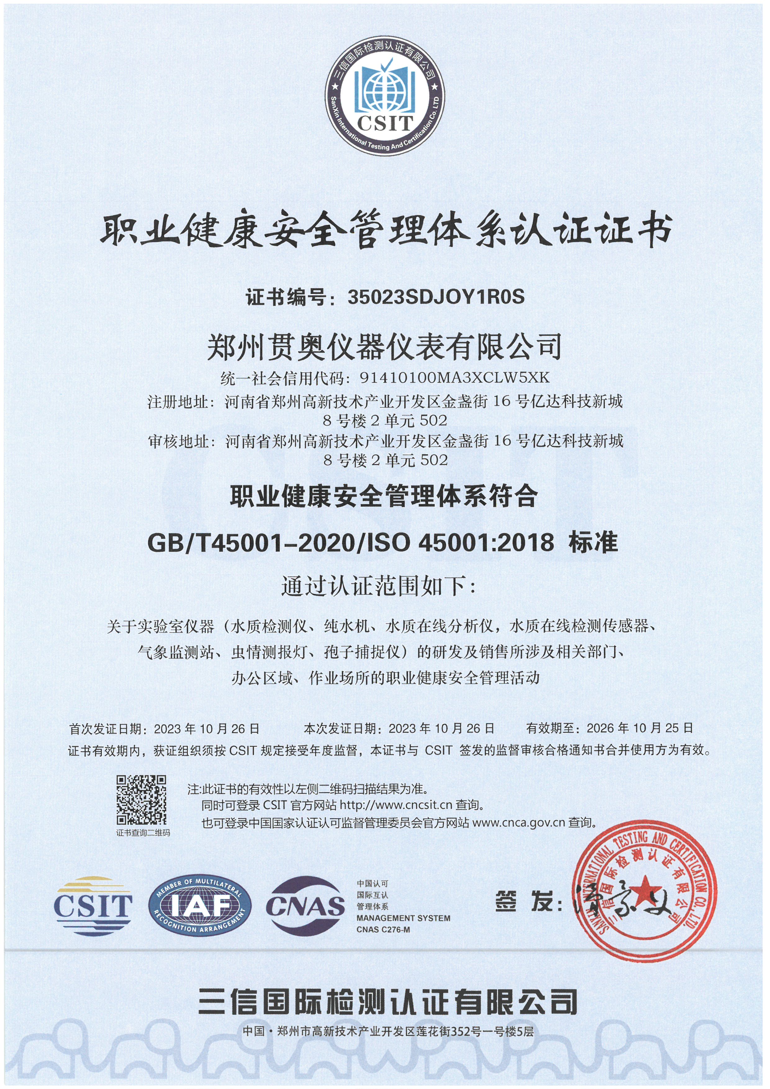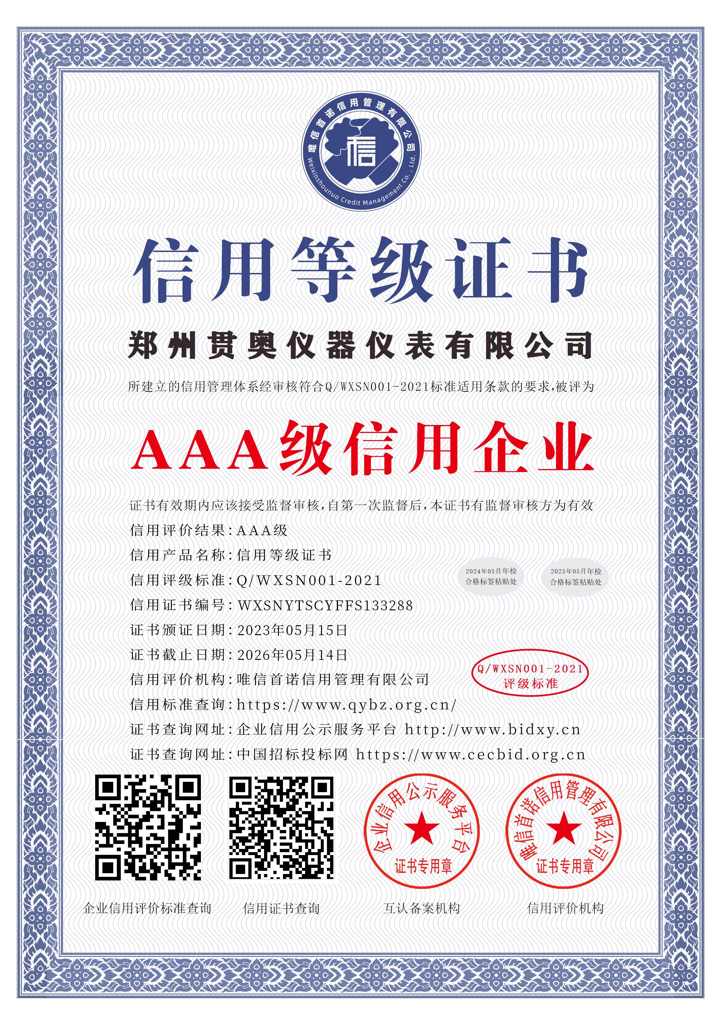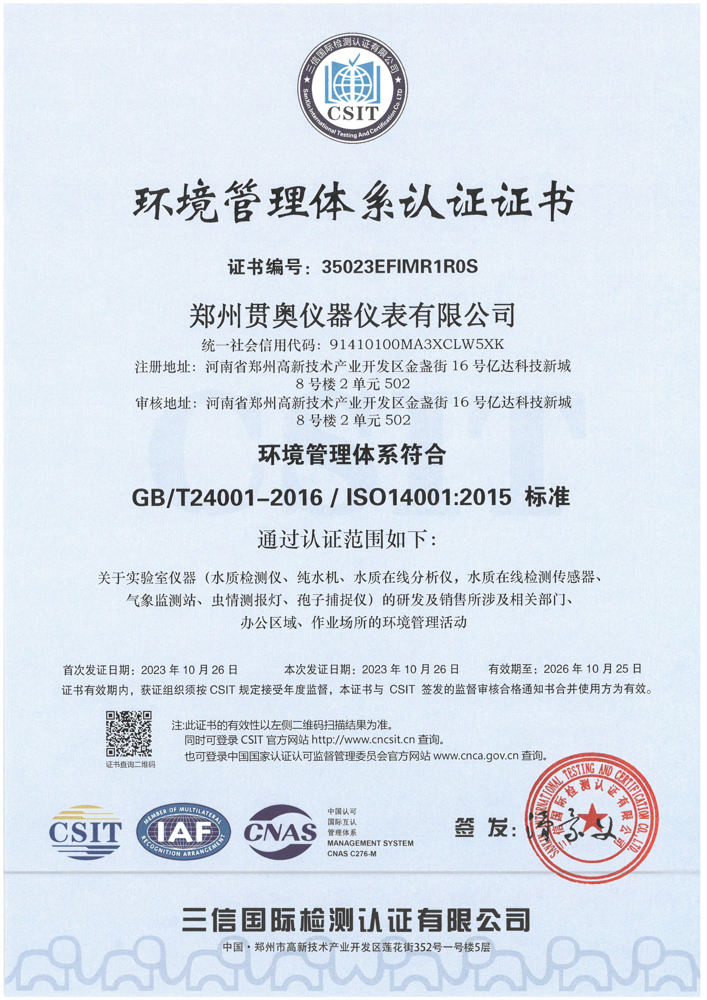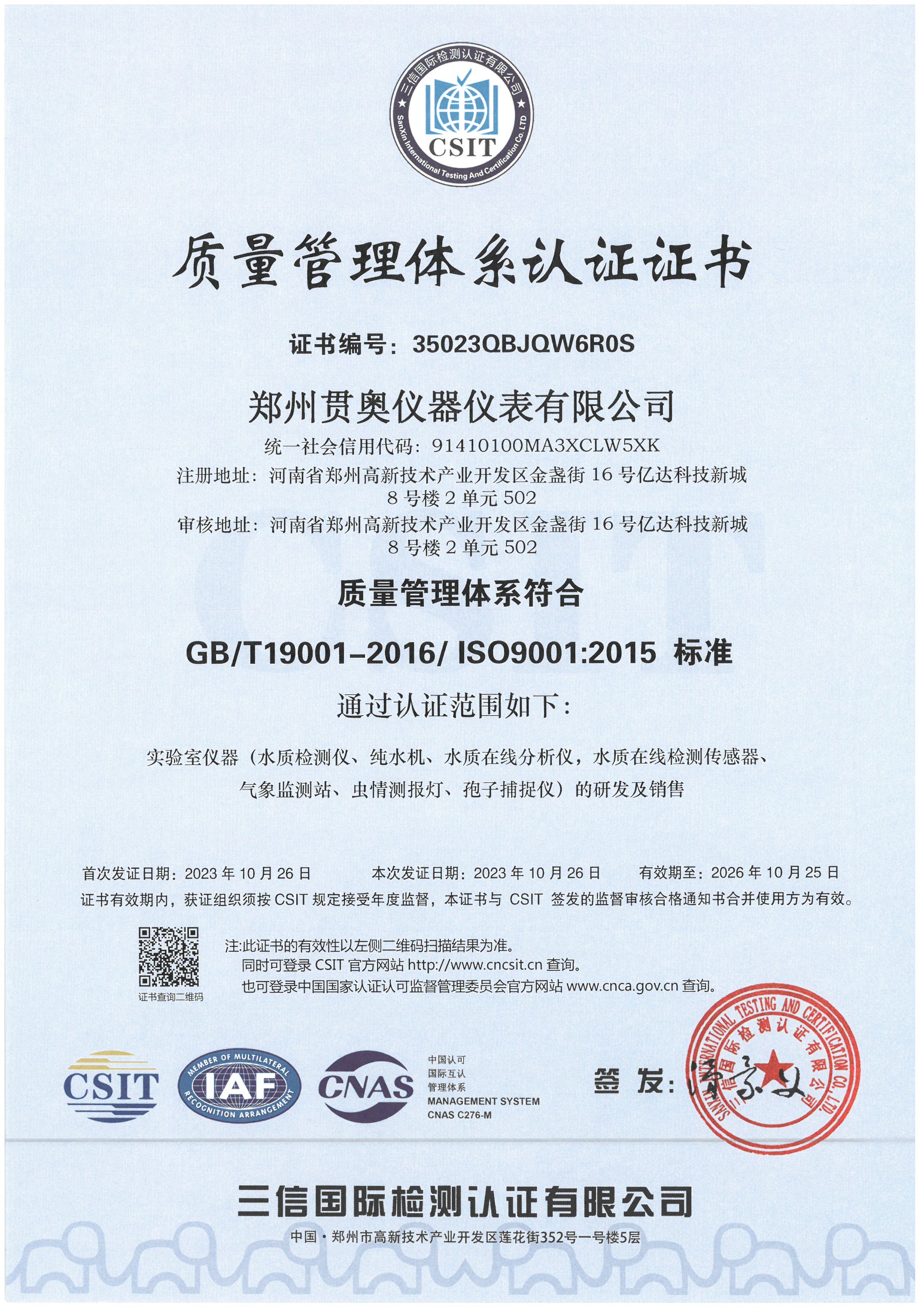 貫奧儀器位于鄭州高新技術產業開發區,是高新技術企業、行業AAA級信用企業,已通過GB/T19001:2016質量管理體系認證、GB/T24001:2016環境管理體系認證和GB/T45001:2020職業健康安全管理體系認證,擁有多項證書,產品已通過河南省電子信息產品質量監督檢驗院檢測,并出具了相關檢驗報告,我們以雄厚的研發實力、過硬的產品質量、完善的售后服務為客戶提供分析檢測技術解決方案,擁有過硬的分析儀器生產技術和整體的水質監測解決方案。
