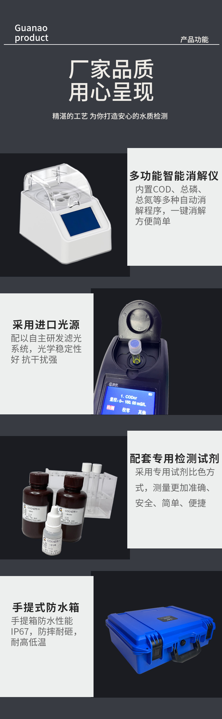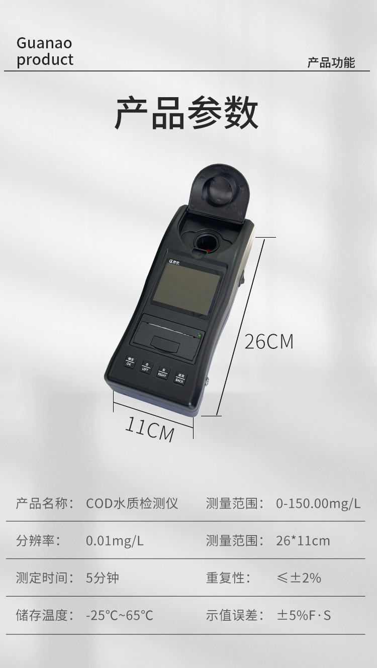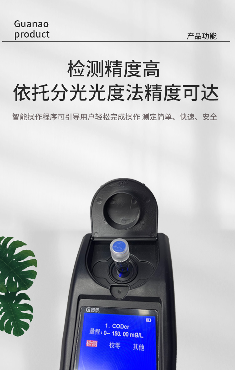 COD測定方法有5種:重鉻酸鹽法、高錳酸鉀法、分光光度法(鉻法)、快速消解法、分光光度法(錳法)。貫奧COD快速測定儀,采用的是分光廣度(Mn)。
