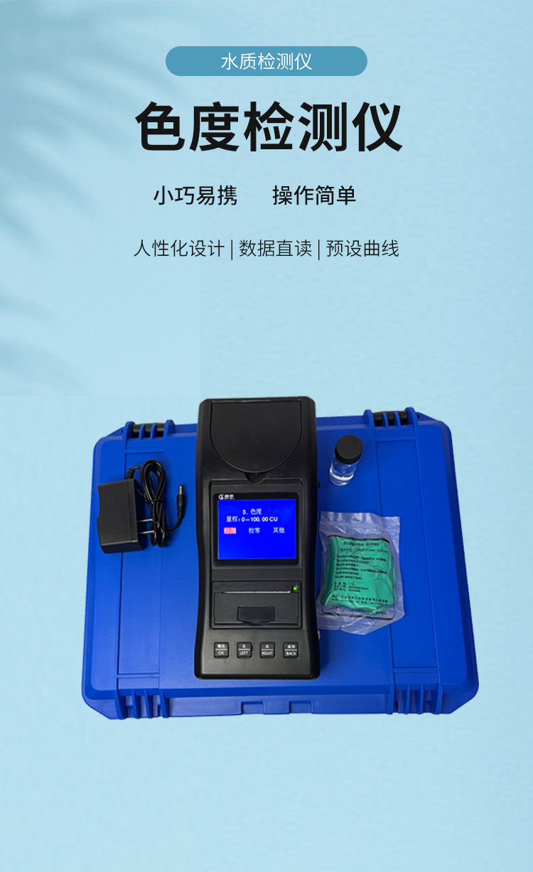 水質色度是對天然水或處理后的各種水進行顏色定量測定時的指標。潔凈的天然水,在水層比較淺時為無色透明,水深時為淺藍色;水體中如果含有雜質,會使水呈現不同的顏色。例如,黏土能使水帶黃色;植物性有機物 溶于水中,使水呈現淡黃色乃至棕黃色;水中藻類大量存在時呈現綠色;鐵的氧化物會使水變褐色;硫